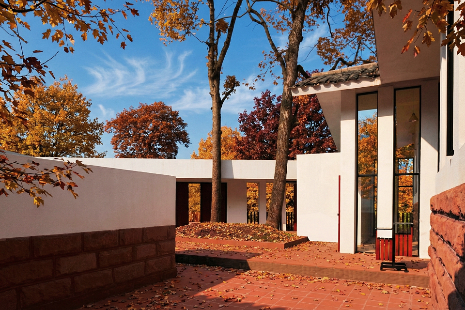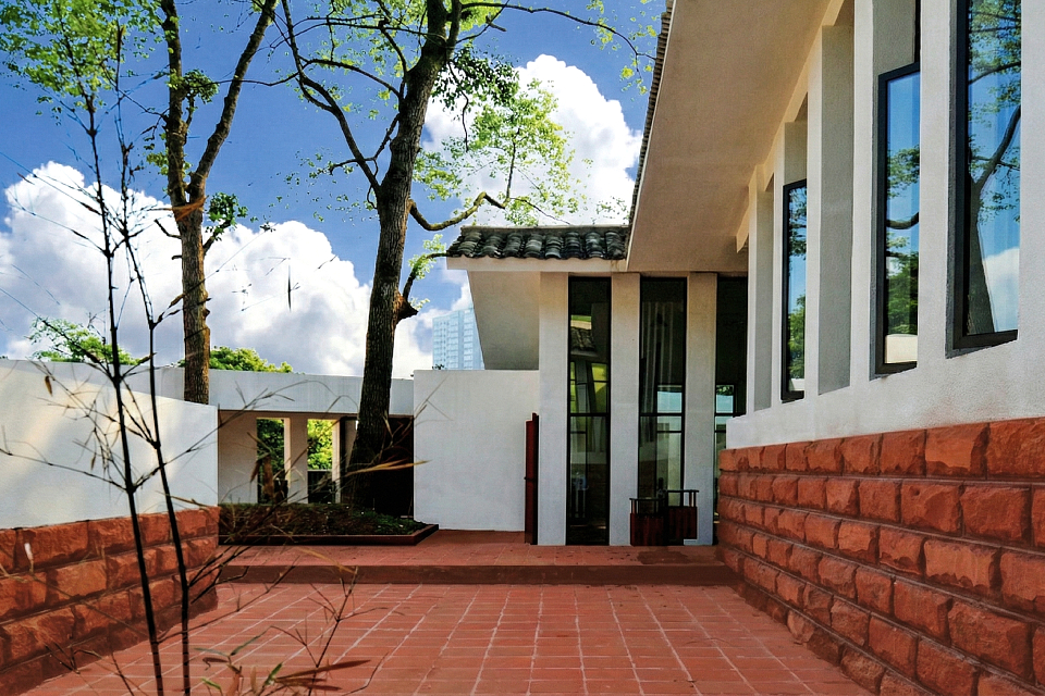 The building is integrated into the Danxia stone hillside, surrounded by traditional gray-tiled houses, with a site elevation difference of over ten meters. Adapting to the terrain, the exhibition hall features a three-tiered terraced courtyard and a circular ramp layout, while preserving old trees and bamboo groves to blend seamlessly with the natural environment. The angled southern design echoes the Danxia stone steps at the cemetery’s main entrance and connects to the northwest vehicle path via an accessible ramp, forming a trapezoidal courtyard arrangement.