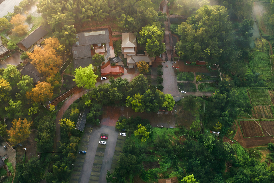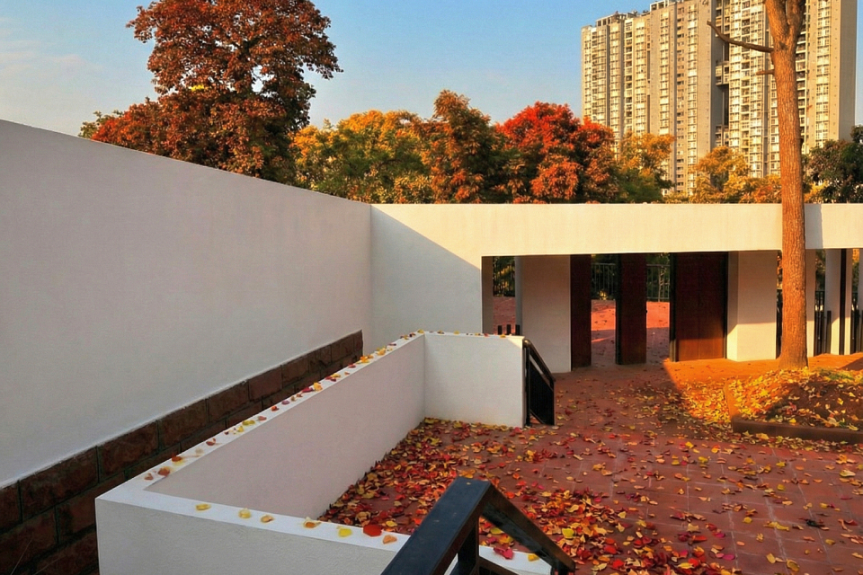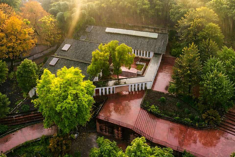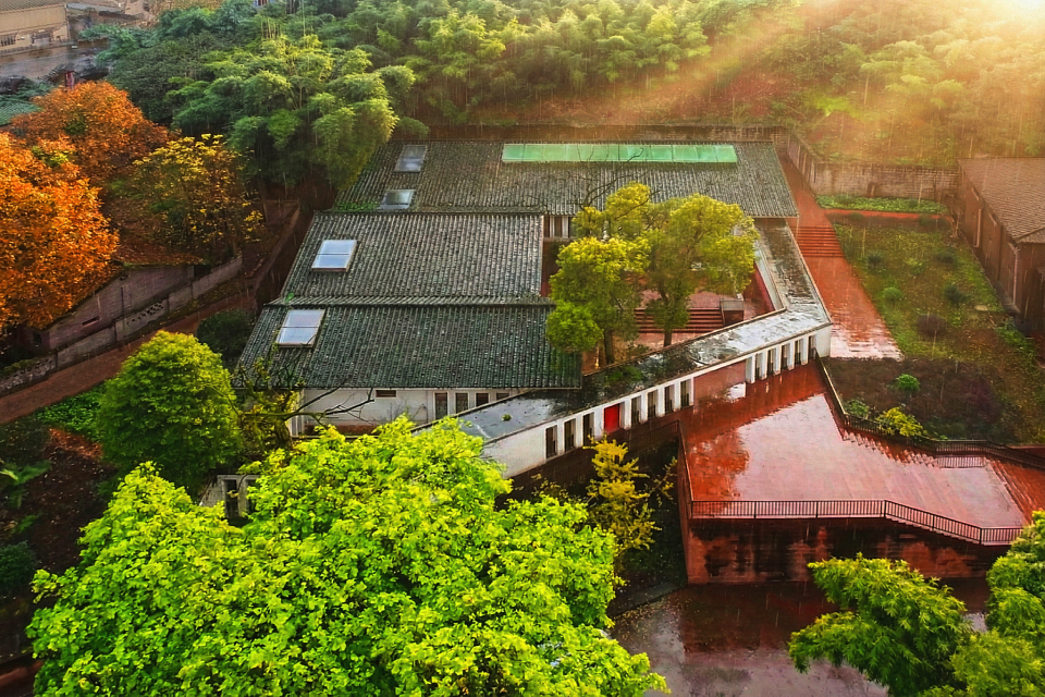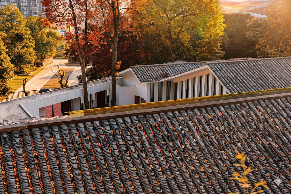 Drawing inspiration from local traditional dwellings, the design transforms gray-tiled sloping roofs into a flowing, undulating roofscape. The multi-courtyard layout is well-suited to the region’s humid climate, creating a solemn yet vibrant atmosphere through thoughtful spatial composition. The courtyards preserve two 50-year-old camphor trees, while a central white terrace and a warmly lit atrium enhance the ceremonial ambiance. A narrow northern light court, enclosed by frosted skylights and white colonnades, evokes a pure and sacred atmosphere, while a triangular courtyard in the northwest corner, adorned with an osmanthus tree, adds a refreshing touch.