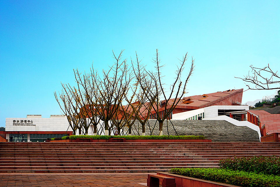 The building is composed of two hierarchical sets of isomorphic units. The first level consists of five red, sawtooth-shaped conical volumes leaning against the mountain, housing office spaces with a visitor center above. The second level is made up of white plinth-like units, connected through courtyards to form a “U”-shaped structure serving the public reception functions of the tourist center. The interlocking configuration of these two layers clearly reflects the influence of local vernacular architecture, characterized by undulating rooflines and stacked foundations.