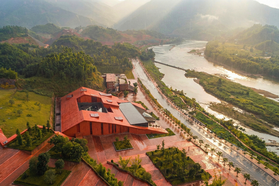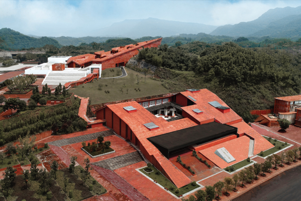 The exhibition center continues the local minority spatial tradition in which sacred and secular functions coexist. The riverside exhibition spaces adopt a gesture of “descending toward the water,” complementing the “ascending toward the mountain” ceremonial center, together shaping a spatial structure that balances ritual character, public accessibility, and artistic expression. Multiple courtyards integrated with carefully controlled natural light work in concert with the exhibits to create an atmosphere reminiscent of the glowing red cliffs of the Danxia landscape. Red Danxia stone is used as the primary building material, giving the architecture the appearance of emerging from the land itself and establishing a spiritual landscape where mountains, water, and architecture are fully integrated.