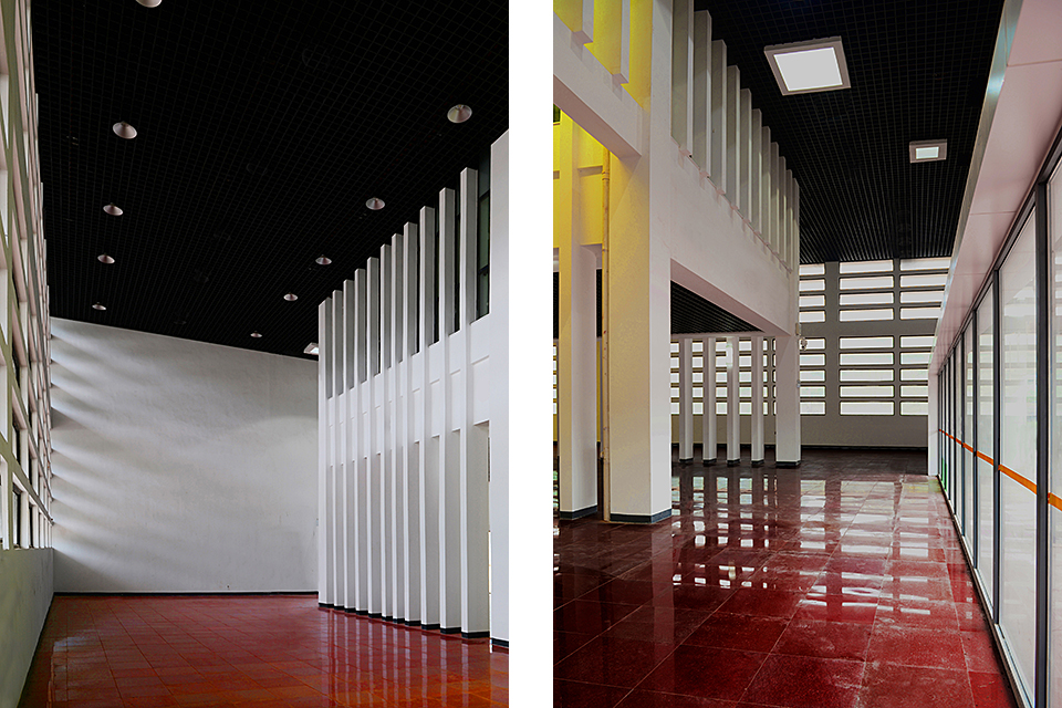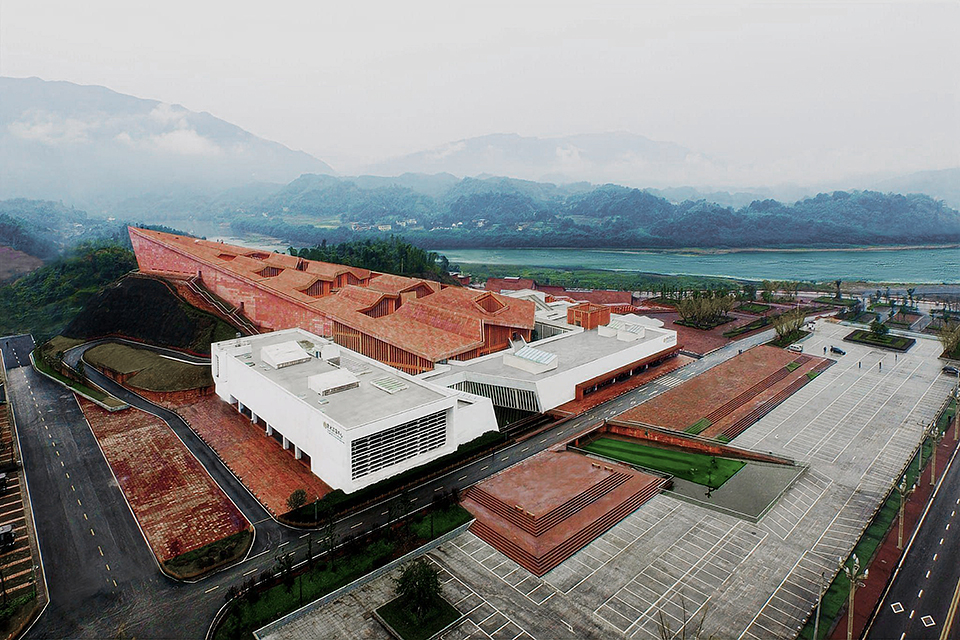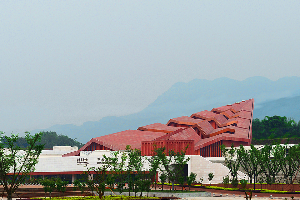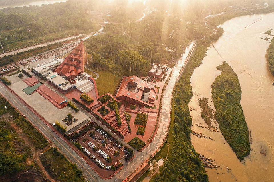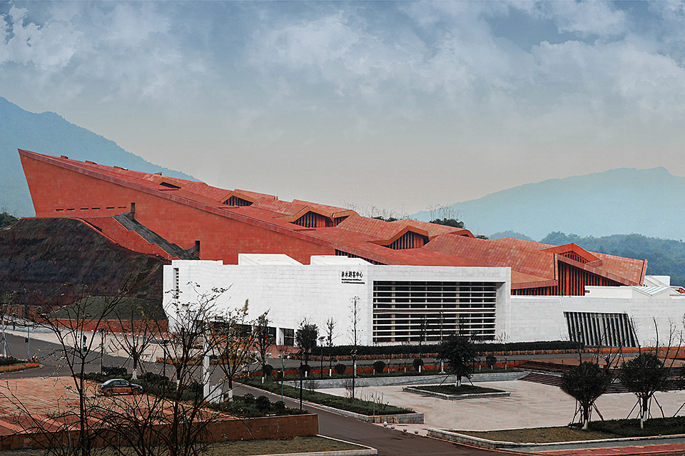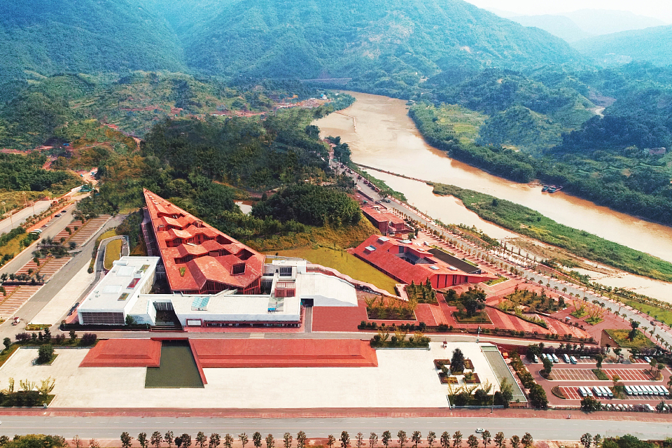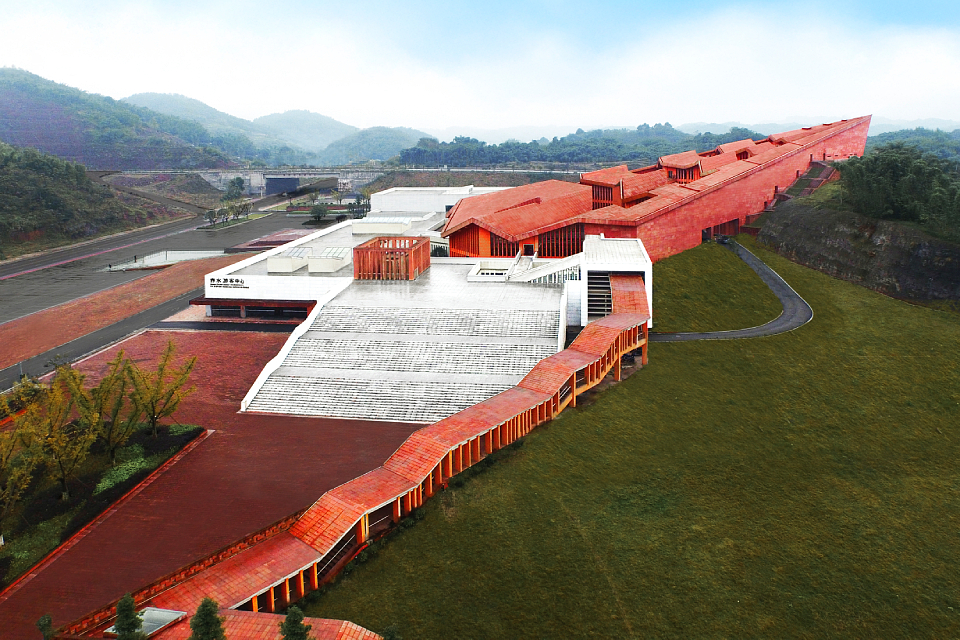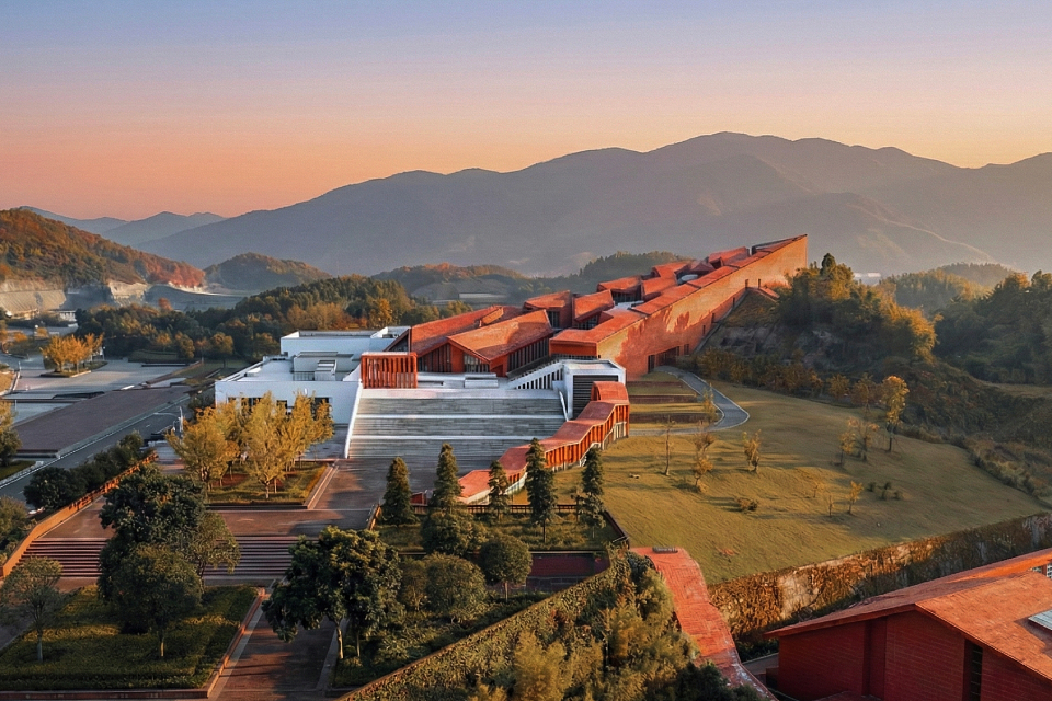 The building is composed of two hierarchical sets of isomorphic units. The first level consists of five red, sawtooth-shaped conical volumes leaning against the mountain, housing office spaces with a visitor center above. The second level is made up of white plinth-like units, connected through courtyards to form a “U”-shaped structure serving the public reception functions of the tourist center. The interlocking configuration of these two layers clearly reflects the influence of local vernacular architecture, characterized by undulating rooflines and stacked foundations.