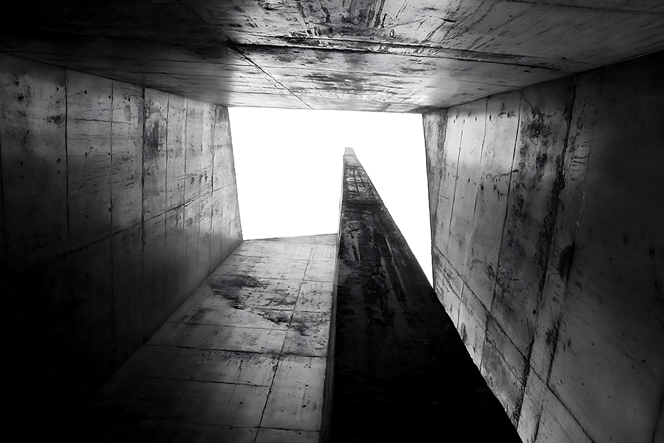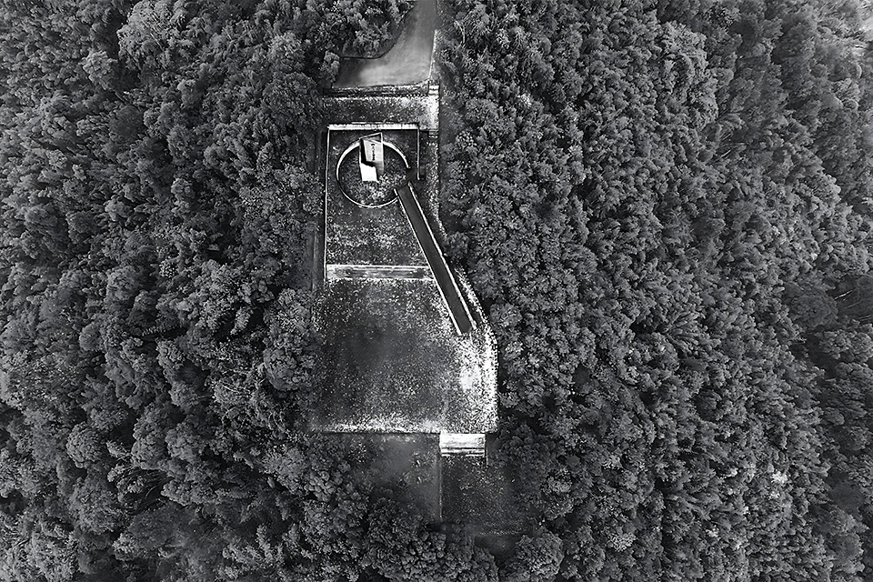 The memorial’s spatial composition consists of three layered enclosing spaces and a platform overlooking the valley. A narrow U-shaped ramp diagonally inserts into a sunken cylindrical space, whose semi-enclosed base is coated in vivid red, echoing the vertical presence of the main structure.