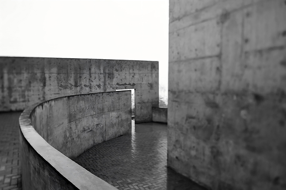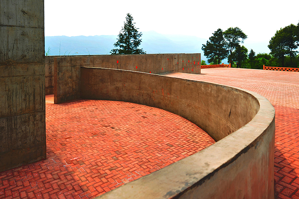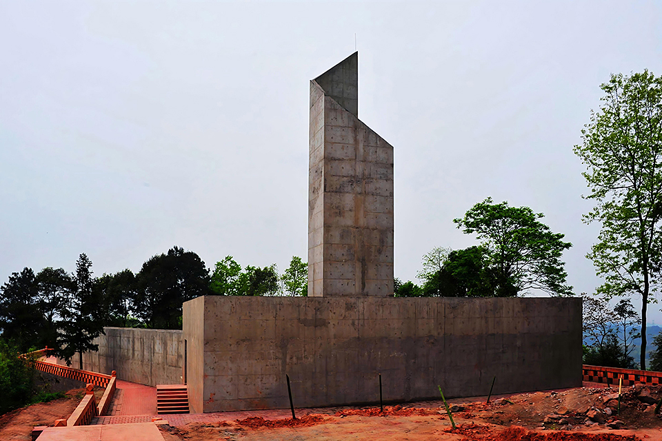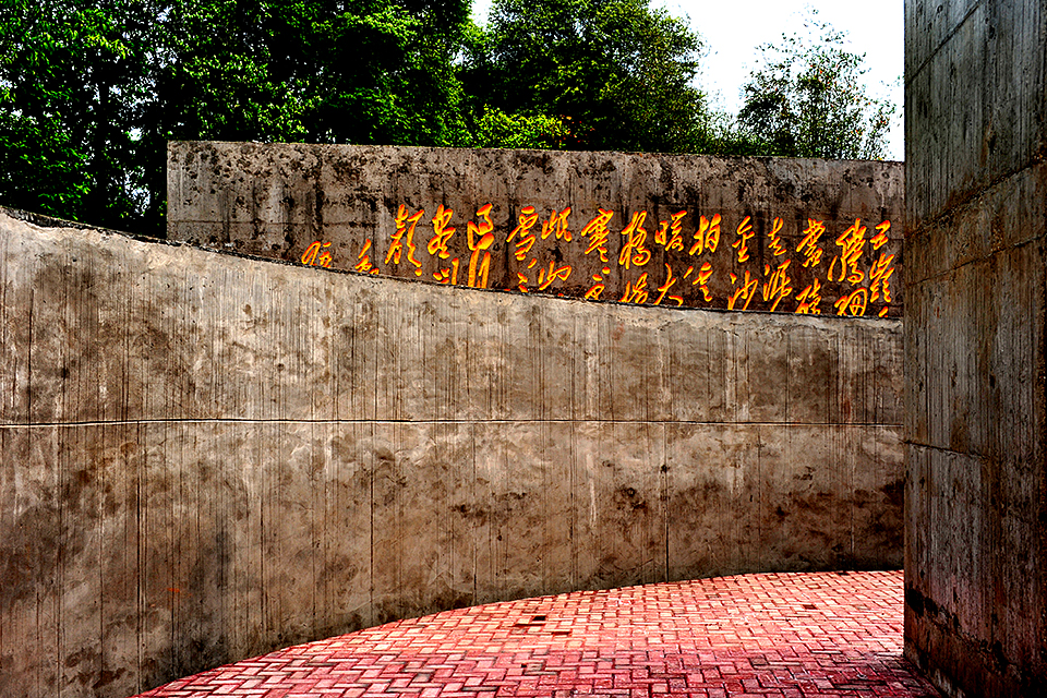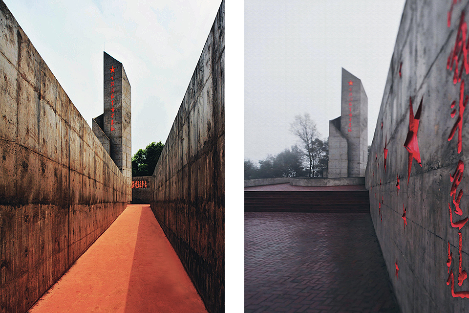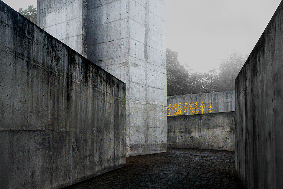 All walls and geometric elements are cast-in-place concrete. The subtle scars and marks formed during mold removal are intentionally highlighted to convey the weathered and enduring character of the site. The pathways are paved with locally sourced sand mixed with iron-red pigment concrete, harmonizing with the overall materiality and reinforcing the memorial’s tactile and visual presence.
