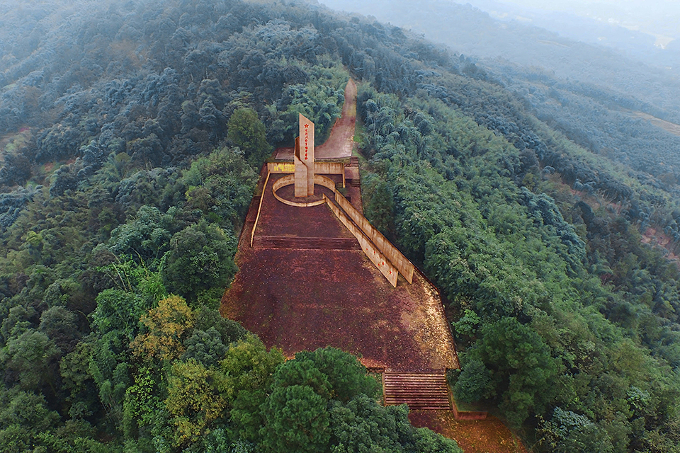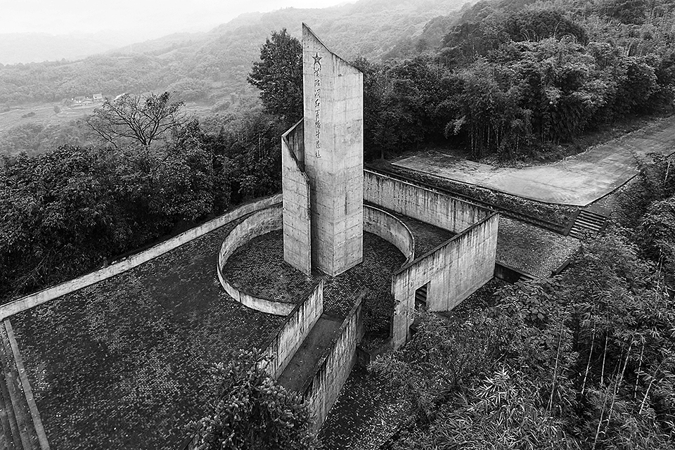 Huangpidong Ruin Concrete Memorial Site, located in Chishui, is a renowned tourist destination in southwest China. Visitors ascend a steep bamboo forest path to reach the mountaintop, where a solitary and resilient structure rises against the dramatic valley landscape, creating a striking visual focal point.
