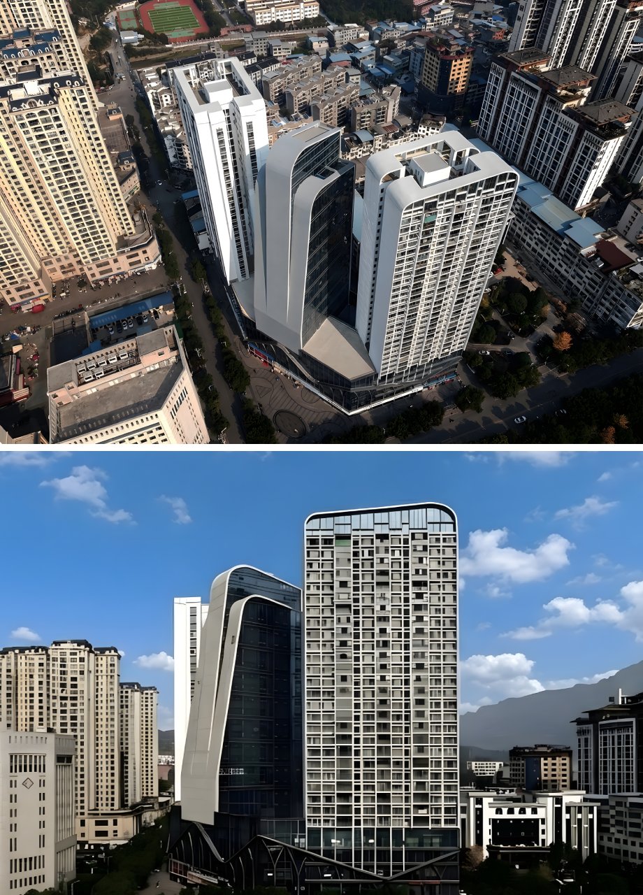 The project is a mixed-use urban complex integrating commercial, office, and residential functions. Using contemporary architectural language, the design responds to local cultural identity and the natural landscape, aiming to create a new urban landmark in the city core that combines functional integration, cultural recognition, and ecological sustainability. Rooted in the region’s reputation as a “hometown of calligraphy,” the design translates the flowing rhythm of calligraphic strokes into the logic of architectural massing and façade articulation. In response to the orientation of local rivers and surrounding topography, the building volumes are shaped through rotation, organic segmentation, and staggered composition, forming a skyline that appears rock-like and organically grown.