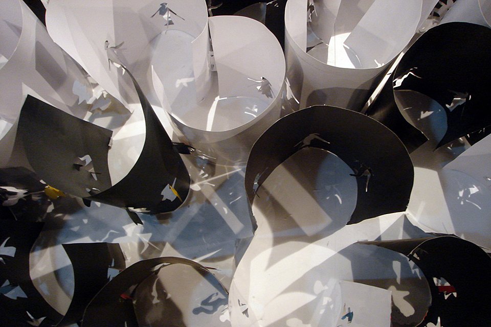 On the spatial level, the design materializes into two types of environments: fluid spaces and retentive spaces. The former possesses qualities of diffusion and penetration, while the latter introduces resistance, naturally generating a tension between motion and stillness. Through the action of “rolling,” the spaces form enclosed or semi-enclosed states, implying centripetal and exclusive aspects of social organization. The whole is constructed from around 300 A3-sized fragments, in a black-to-white ratio of roughly 4:6. Arranged in proximity, in linear sequences, in clusters, or as isolated units, these fragments produce diverse boundary configurations that articulate the complex interactions between systems and social structures.