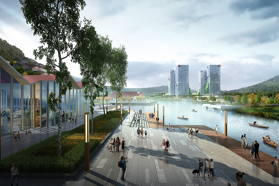 At the master-planning scale, the project employs a strategy of repetitive isomorphic units to form the spatial framework. Through serrated plan topologies and the aggregation of courtyard-based units, the building clusters grow organically along the terrain and waterfront green corridors. Both the agricultural development complex and the boutique hotel clusters adopt layered and folded isomorphic roofs combined with courtyards at multiple scales, evoking the rhythm of overlapping mountain ranges and achieving a contemporary translation of local topography and vernacular dwelling traditions.
